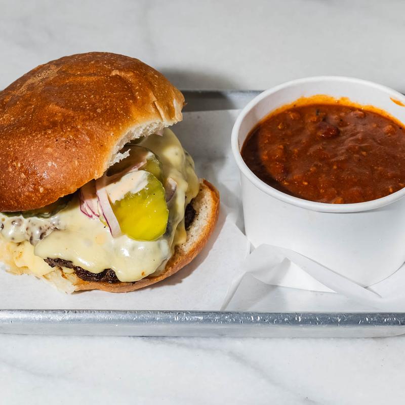 Black Angus beef, American cheese, pickled jalapenos, black Angus chili on a potato bun