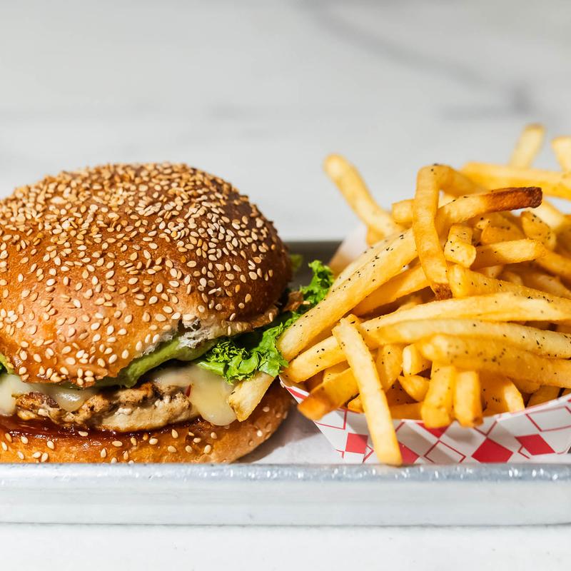 Turkey Burger with pepper jack cheese, lettuce, avocado puree and BBQ sauce on a sesame bun. Served with fries and canned beverage.