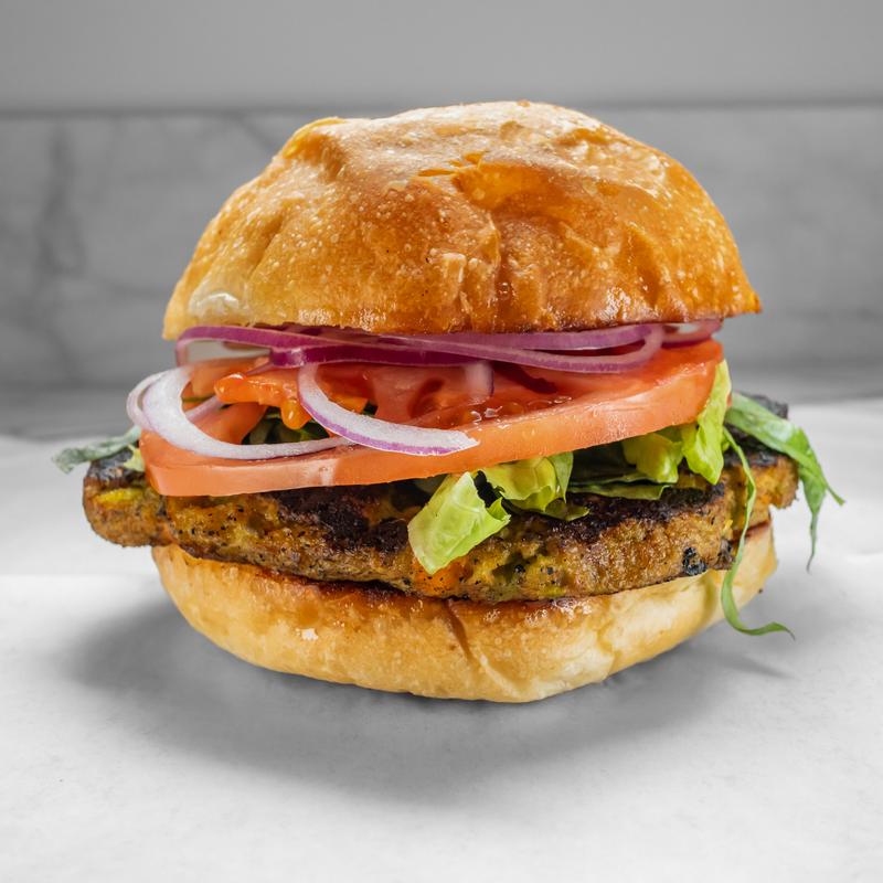 4 oz black Angus beef patty with house seasoning, caramelized onion, pickled jalapenos on an Orwasher's sesame bun with lettuce, tomato, and black pepper aioli.